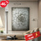 Une grande fleur en relief s'étend sur toute la toile, avec des pétales argentés qui captent la lumière. La texture élégante et la symétrie florale offrent un sentiment de sérénité et de renouveau.