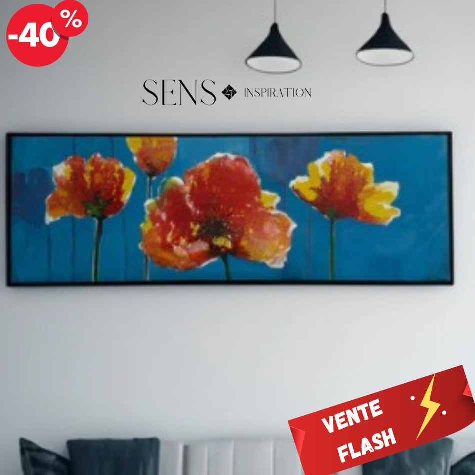 Description : Un éclat vibrant de fleurs jaunes et rouges se détache sur un fond bleu intense, évoquant la force et la beauté de la nature en pleine floraison. Les pétales aux couleurs chaudes contrastent avec le fond apaisant, créant une atmosphère à la fois énergique et sereine. Ces titres et descriptions mettent en valeur le caractère unique et l’ambiance de chaque œuvre.