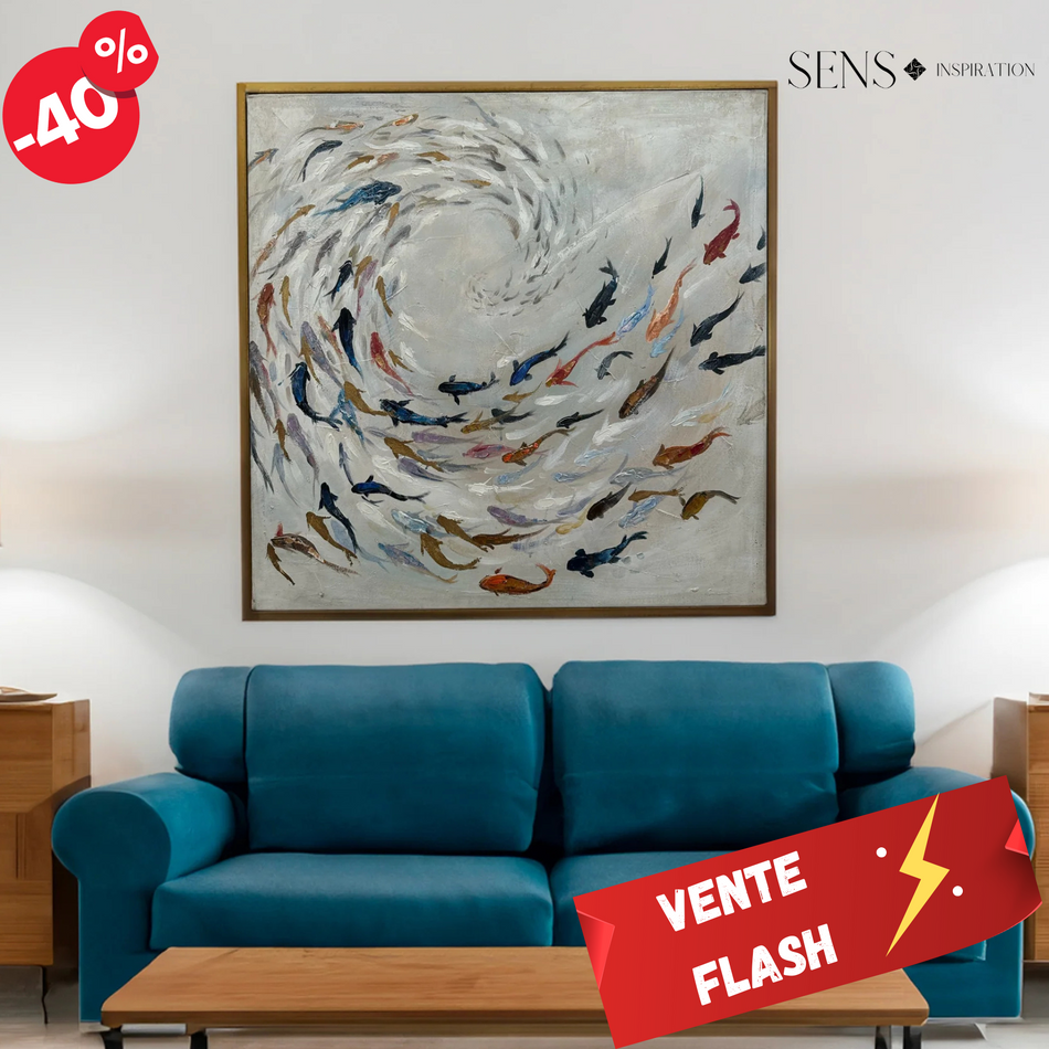 Cette œuvre d'art captivante représente Poésie Aquatique capture un tourbillon de poissons colorés dans une danse harmonieuse, évoquant la fluidité et la force des courants sous-marins. Les teintes vibrantes et les reflets lumineux créent une atmosphère apaisante et hypnotique, invitant le spectateur à plonger dans la beauté mystérieuse du monde aquatique. .