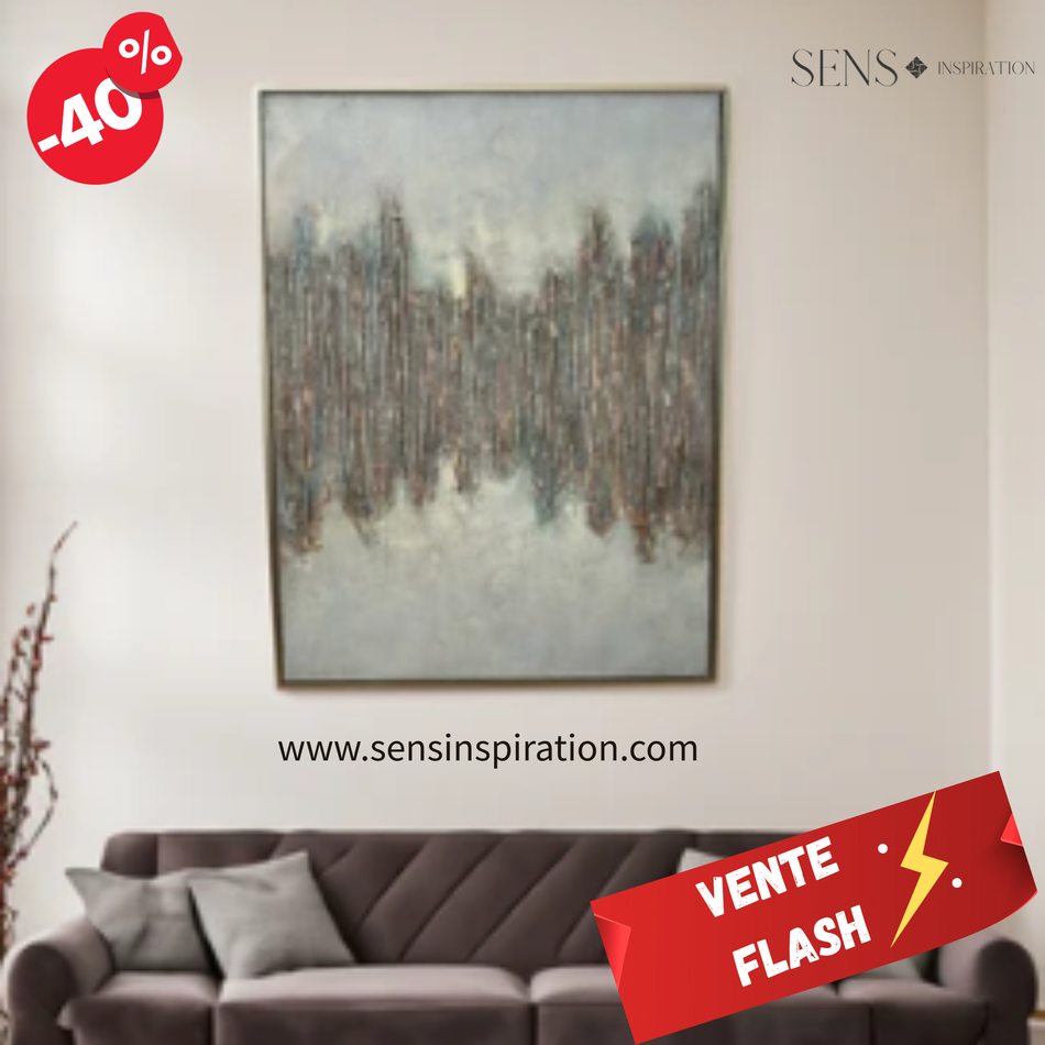 Des traits verticaux en relief imitent une forêt dense, figée dans le temps. Les teintes subtiles de gris et de brun ajoutent une atmosphère mystérieuse et presque magique.