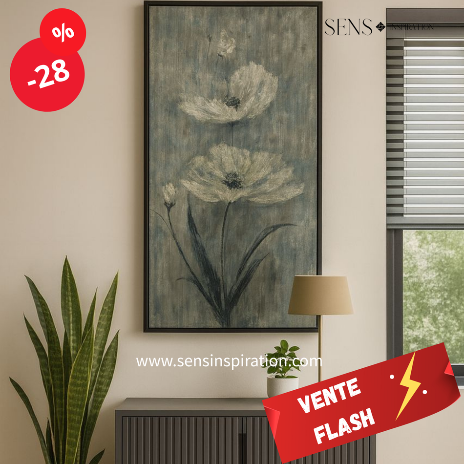 Deux roses élancées s’épanouissent dans des nuances délicates de bleu et de gris, créant une atmosphère empreinte de mystère et de raffinement. Leur verticalité contraste avec la douceur des teintes, symbolisant à la fois la fragilité et la résilience. Cette composition minimaliste invite à contempler la beauté éthérée de la nature dans sa forme la plus pure.