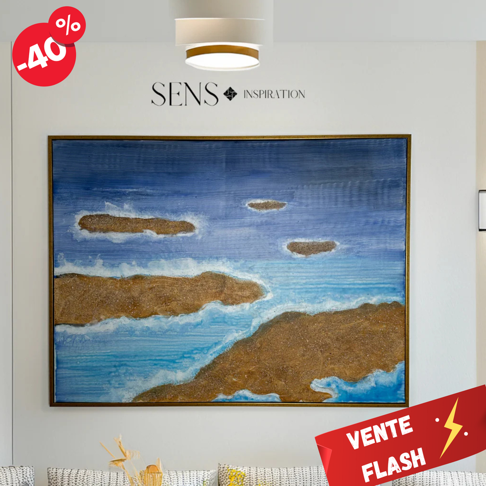 Cette œuvre d'art représente un océan bleu vibrant, évoquant la sérénité et la profondeur des mers, contrasté par un mur blanc pur qui apporte une touche de modernité et de minimalisme. Les nuances de bleu capturent la lumière et le mouvement des vagues, tandis que le mur blanc sert de toile de fond apaisante, créant un équilibre harmonieux entre la nature et l'architecture. Cette peinture est idéale pour ceux qui recherchent une pièce décorative qui inspire la tranquillité et la réflexion.