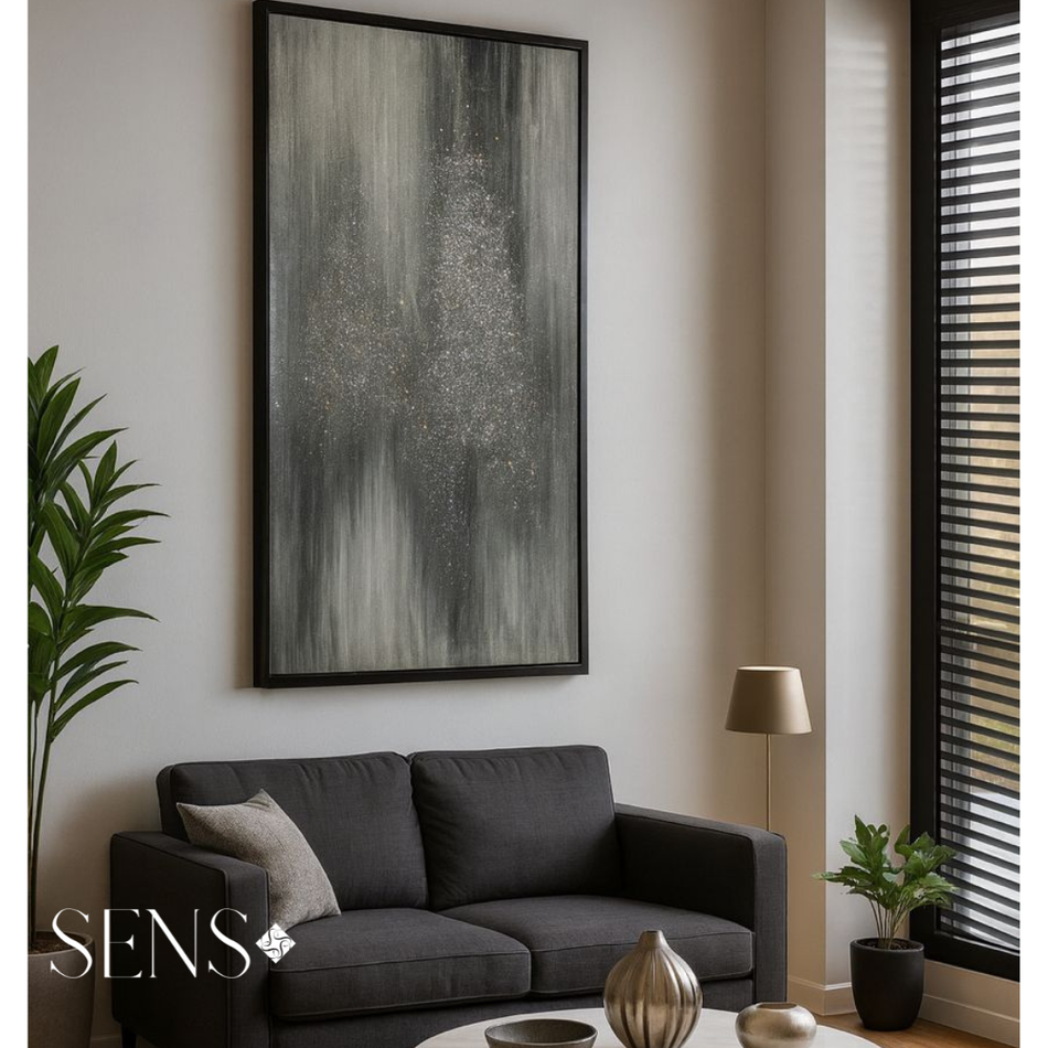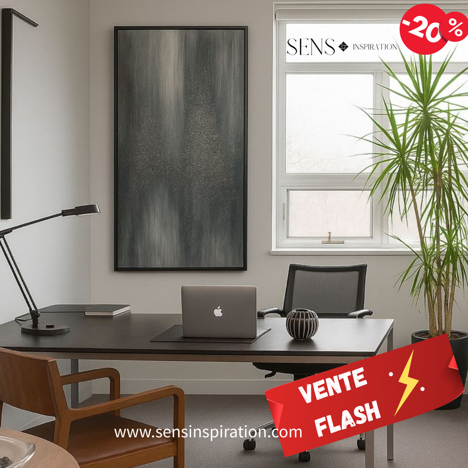 Une toile abstraite dominée par des nuances de gris, où des formes et des textures s’entrelacent pour créer une atmosphère intrigante et introspective. Chaque détail semble inviter le spectateur à explorer des émotions cachées, évoquant à la fois l'ombre et la lumière, le tangible et l'insaisissable. Cette œuvre incarne une élégance sobre, chargée de profondeur.