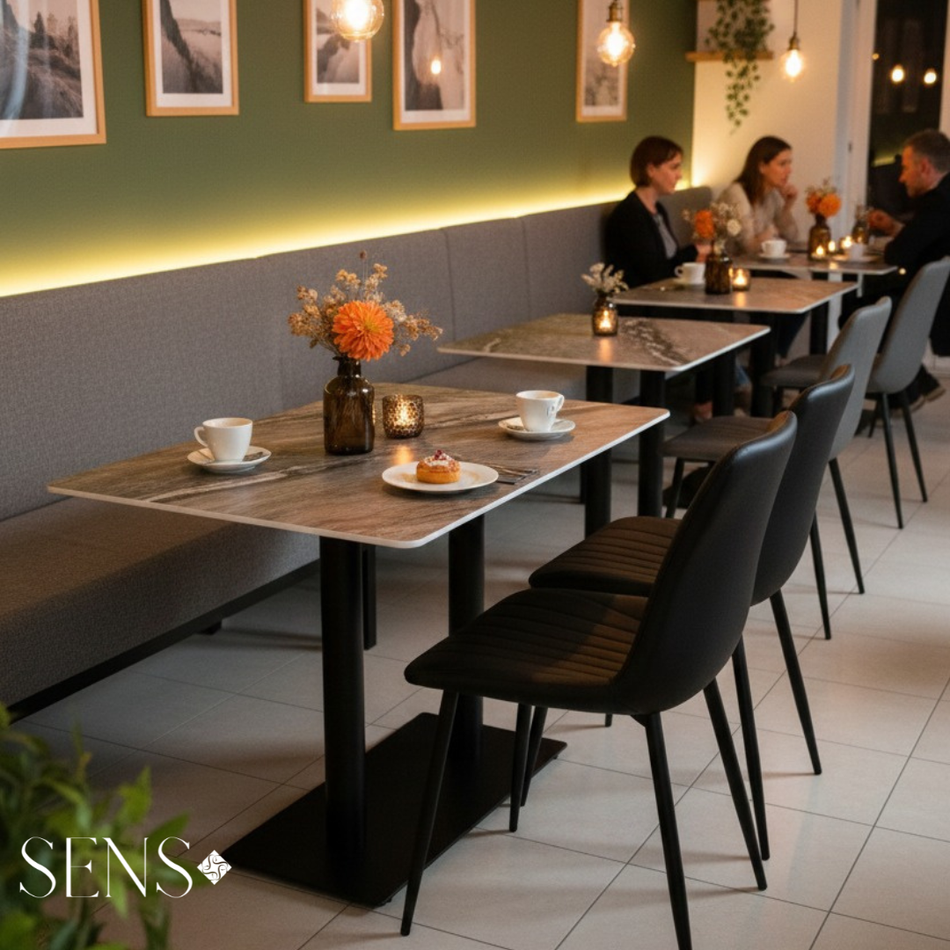 Son plateau résistant et ses pieds en métal noir mat offrent à la fois solidité et sophistication, faisant de Savora une pièce idéale pour des repas élégants et conviviaux au quotidien.